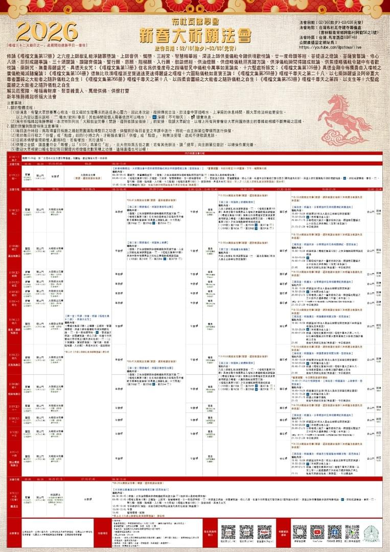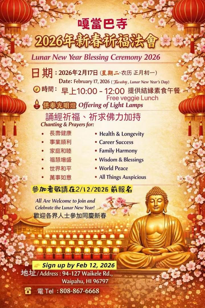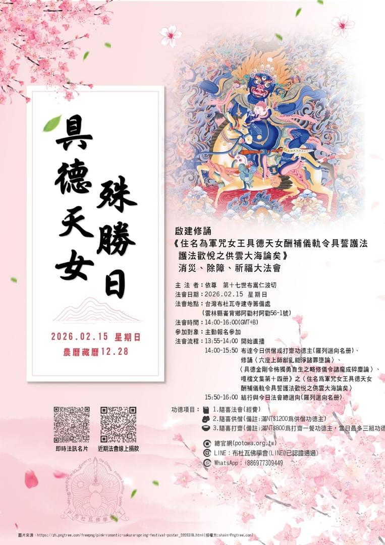 2026年2月5日📆02/16週一除夕~03/03週二元宵 【法會名稱:2026年新春大祈願法會】 [👑嘎檔三十二大節日之一.此期間功德勝平日一億倍]修誦《嘎檔文集第12冊》之六座上師猷釓能淨諸罪墮論、上...2026年2月5日布杜瓦佛學會2月份的大型法會 📆02/15週日,晚間19:00-22:00 【標題:】🙏2026年農藏曆十二月廿八具德天女殊勝日啟建修誦〈住名為軍咒女王具德天女酬補儀軌令具誓護法歡悅之供...2026年2月5日好消息! 這是今天2026年2月5號尼泊爾嘎檔寺及金鬘寺早餐、午餐及晚餐,由具壽者江可伯大近善、江林泰令大猷釓士、江趙學平大德、江其芝大德、Nick Sagar尼沙加大德、Tai...2026年2月1日2026年2月5日📆02/16週一除夕~03/03週二元宵 【法會名稱:2026年新春大祈願法會】 [👑嘎檔三十二大節日之一.此期間功德勝平日一億倍]修誦《嘎檔文集第12冊》之六座上師猷釓能淨諸罪墮論、上...2026年2月5日好消息! 這是今天2026年2月5號尼泊爾嘎檔寺及金鬘寺早餐、午餐及晚餐,由具壽者江可伯大近善、江林泰令大猷釓士、江趙學平大德、江其芝大德、Nick Sagar尼沙加大德、Tai...2026年2月5日布杜瓦佛學會2月份的大型法會 📆02/15週日,晚間19:00-22:00 【標題:】🙏2026年農藏曆十二月廿八具德天女殊勝日啟建修誦〈住名為軍咒女王具德天女酬補儀軌令具誓護法歡悅之供...2026年2月1日更多文章嘎檔派的特殊節日