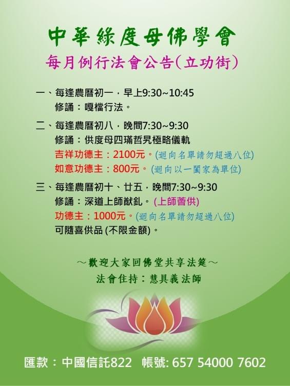 照顧之清寒、貧困家庭等弱勢族人士所需物資及經費、救助流浪狗、辦理公益慈善及社會教化事業、助印佛經出版品....等,
