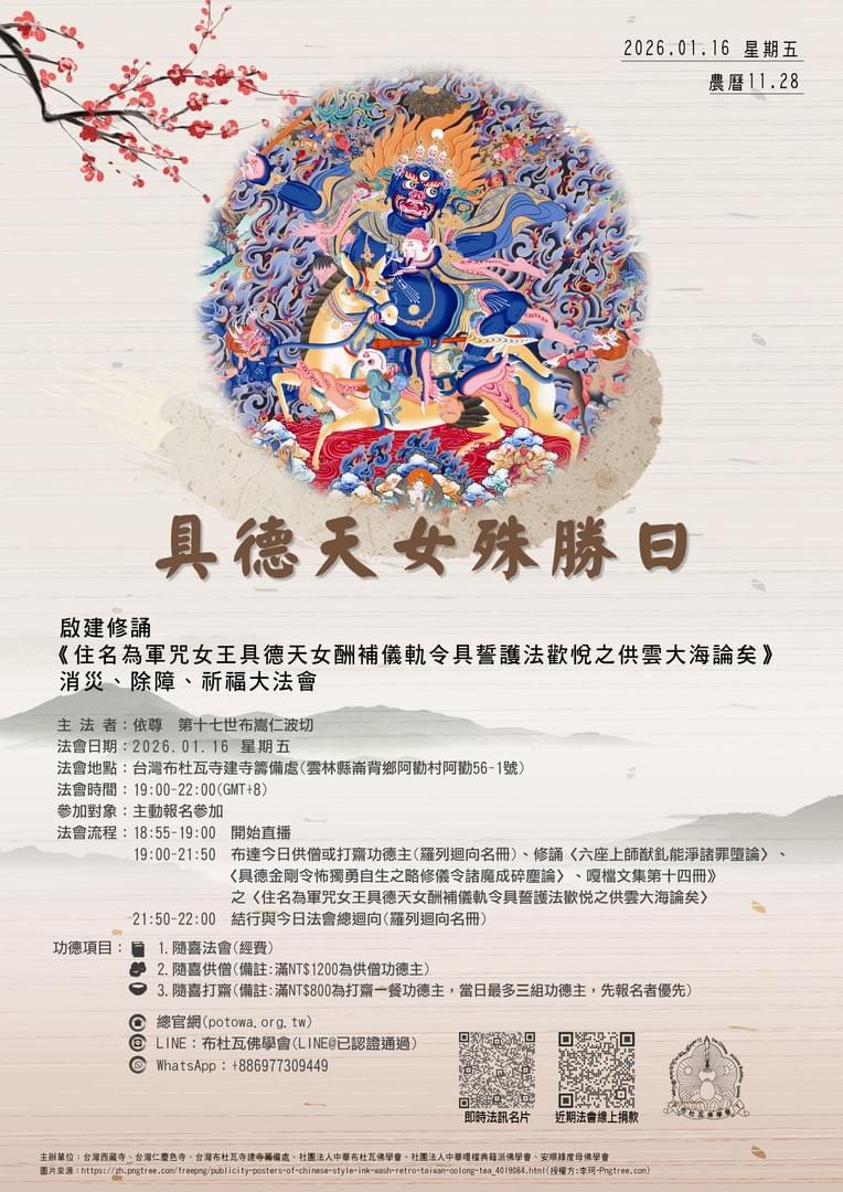 2026年農曆十一月廿八具德天女殊勝日啟建修誦 〈住名為軍咒女王具德天女酬補儀軌令具誓護法歡悅之供雲大海論矣〉、具德天女咒 消災、除障、祈福大法會 【時間】01/16週五,晚上19:00-22...