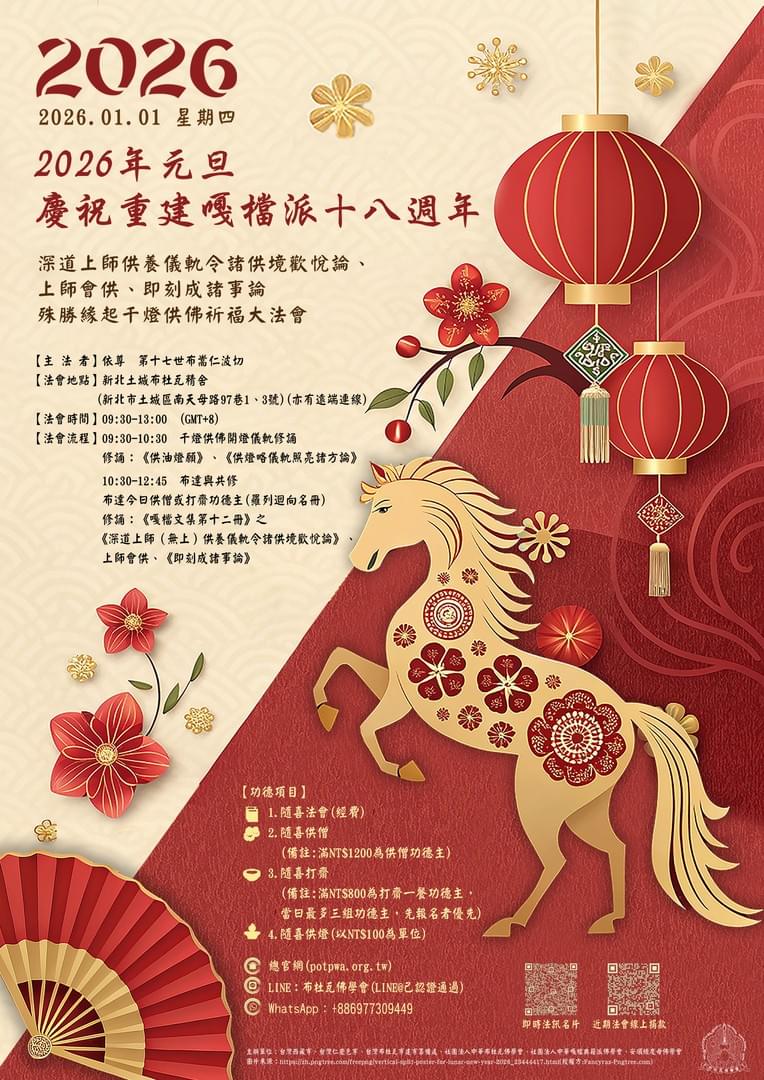 2026年元旦慶祝重建嘎檔派十八週年 深道上師供養儀軌令諸供境歡悅論、上師會供、即刻成諸事論 殊勝緣起千燈供佛祈福大法會 【時間】01/01週四,早上09:30-13:00 【地點】新北土城...